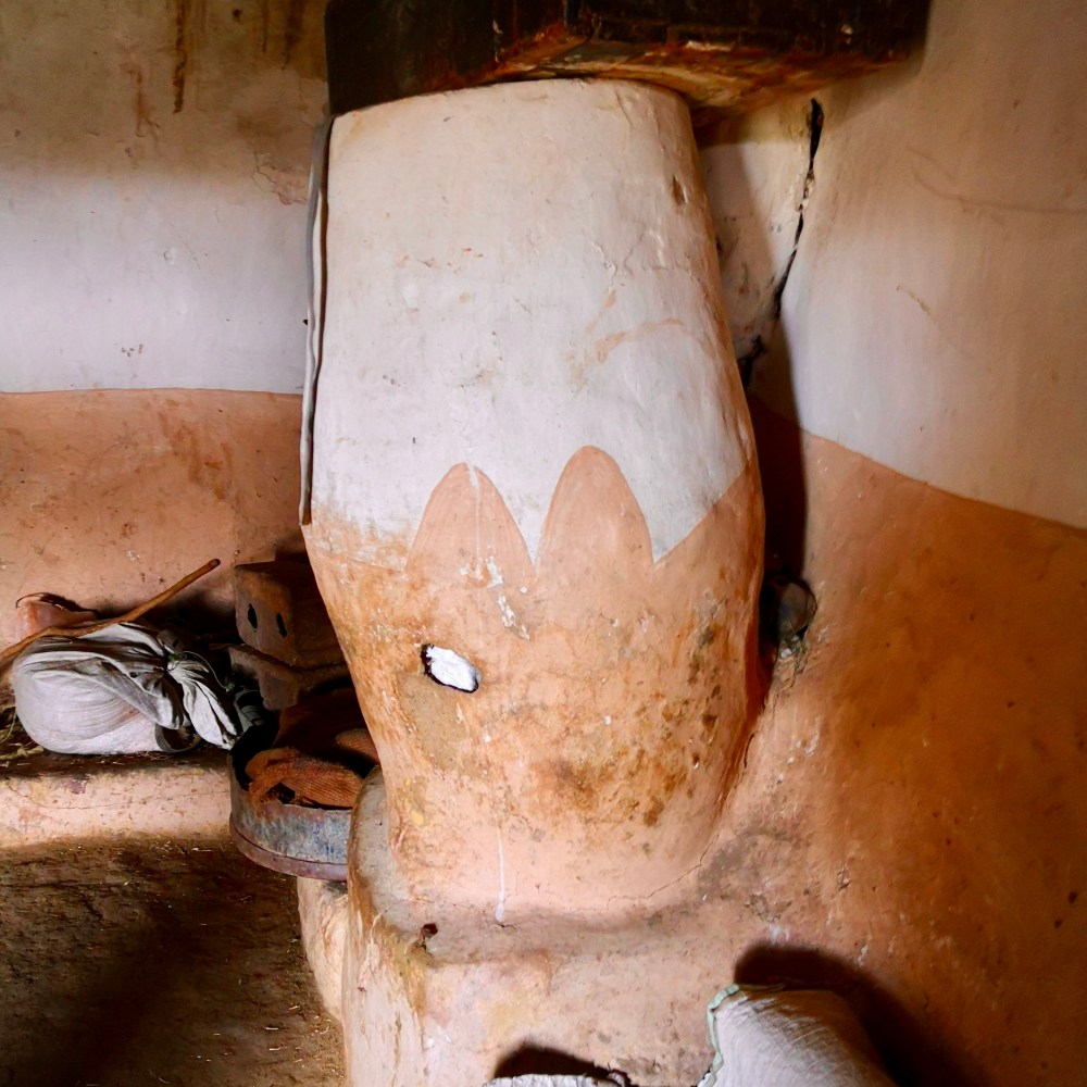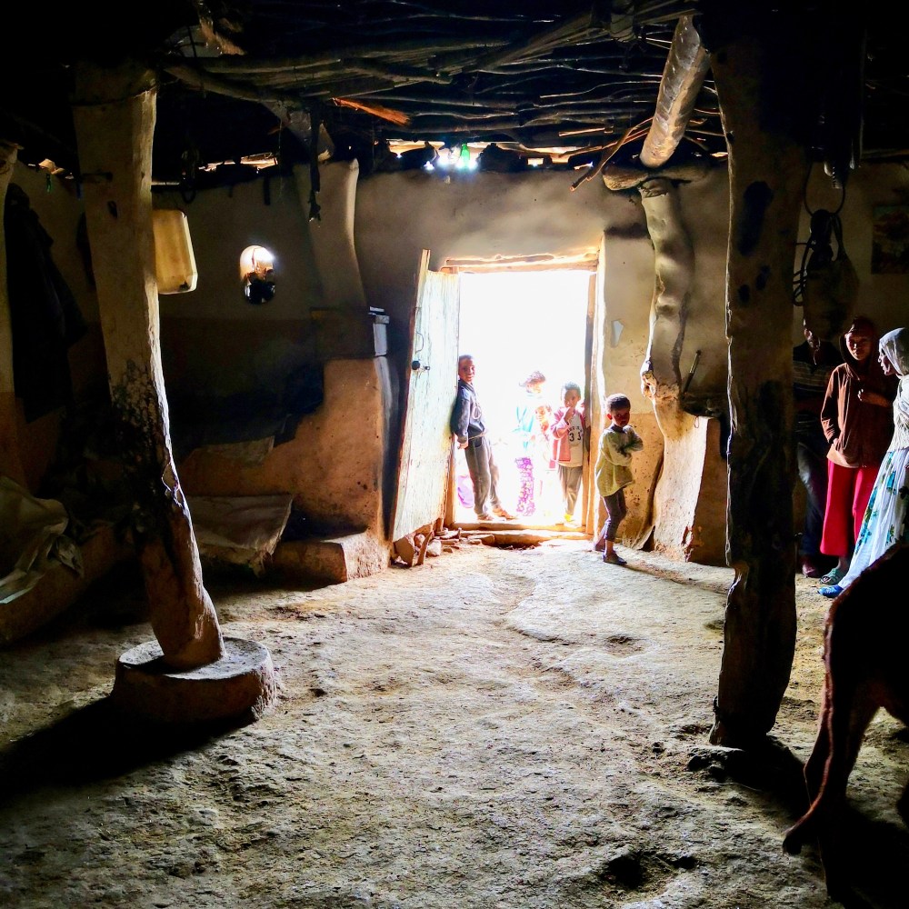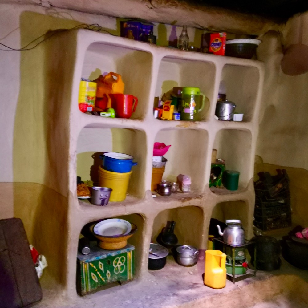 Durch eine schwere Massivholztür betreten wir einen etwa 6x6m messenden quadratischen, fensterlosen Raum. Links und rechts des Eingangs befinden sich zwei aus Lehm geformte, erhabene Schlafnischen. Eine für die Eltern und das jüngste Kind und eine für die weiteren Kinder der Familie. Keine Kinderzimmer, keine Babyphone und kein „back to sleep“ also. Der Boden dieses großen Wohnraumes ist überzogen von Hufabdrücken, denn nachts treibt man hier das Vieh hinein. Die wenigen Rinder sind beides – der kostbarste Besitz und die Standheizung der Familie in bitterkalten Nächten. Auch die Hühner finden nachts in diesem zentralen Raum Platz und nächtigen in einem an der Decke hängenden Korb. Gerne würde man mal bei Einbruch der vollkommenen Dunkelheit in einer dieser Nischen bei Gackern und Wiederkäuen einschlummern. Bei genauer Betrachtung ähnelt das Haus sehr dem, was andere Bergvölker auf Ihren Almen an Gebäuden errichten – auch in den Alpen war es vor Kurzem noch nicht so sehr anders.