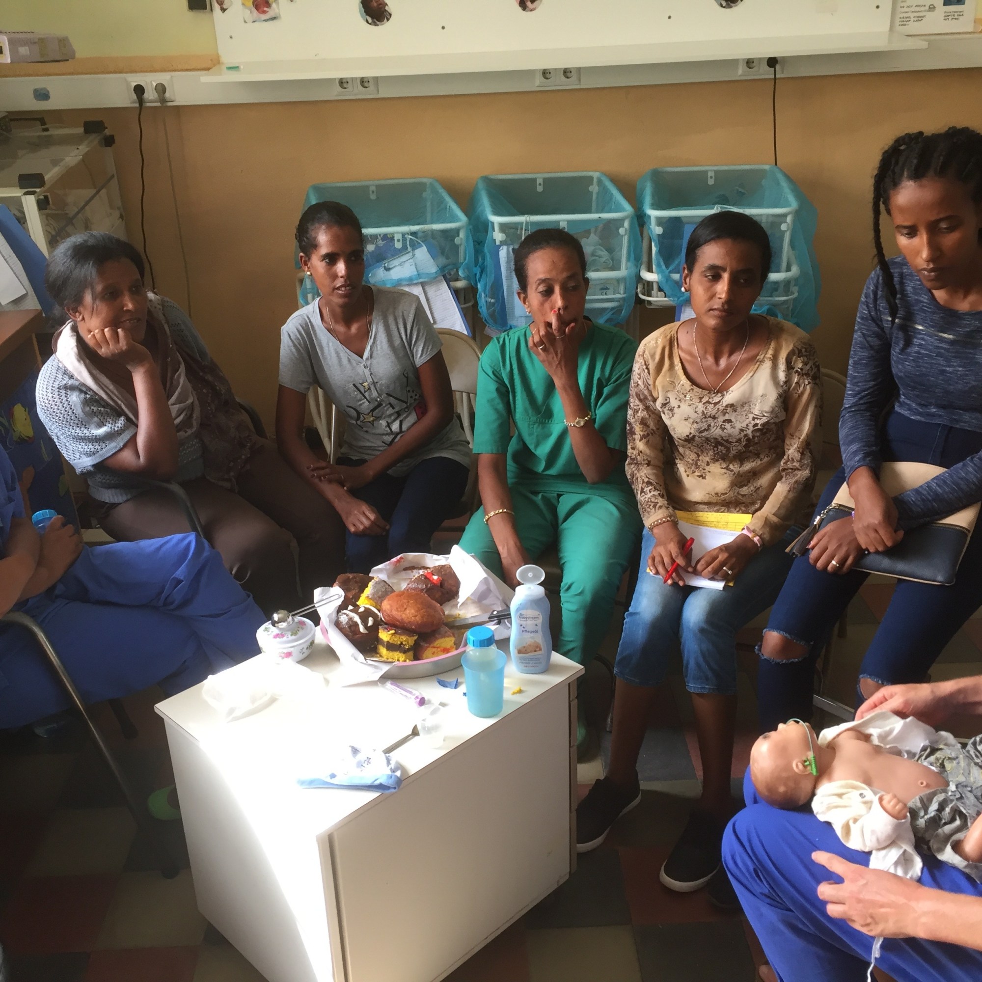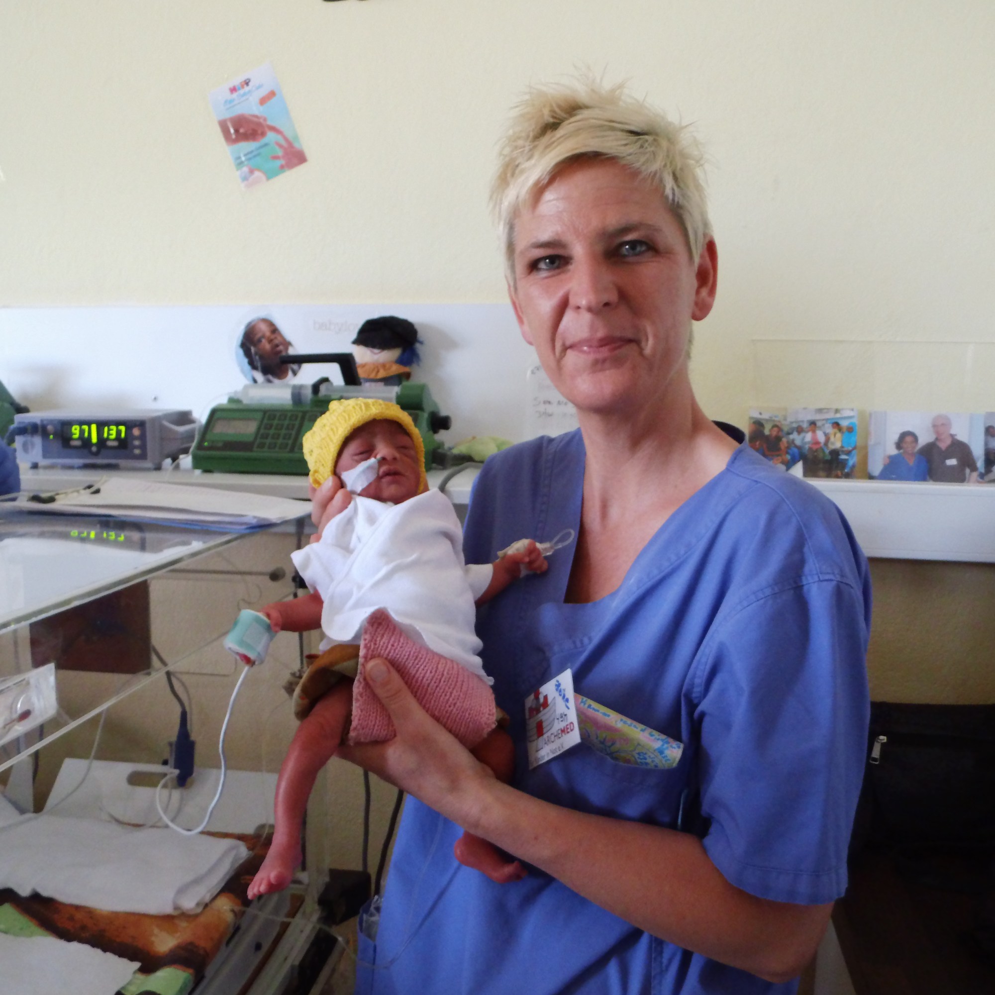 Grund dafür war auch ein kleines Frühchen, das 2013 bei uns auf die Neo kam und mein „eritreischer Sohn“ wurde. Ich war schockverliebt in diesen kleinen Jungen, der in der 32.SSW mit einem Gewicht von 1250 gr bei uns aufgenommen wurde. Genauso ging es mir mit seiner Mutter und seinen beiden großen Schwestern. Ich bzw unser Team hatte 14 Tage Zeit diese kleine Frühgeborene zu stabilieren, mit den Mitteln die wir hatten. Immer wieder, jeden Tag eine neue Herausforderung….Stromausfälle, Geräte defekt, kein Sauerstoff, keine Medikamente,….! Die Mama sprach zum Glück gut Englisch und ich habe ihr viel erklärt und rund um die Uhr das Kind mit ihr versorgt. Von Anfang an hatten wir ein sehr enges Verhältnis und haben uns gut verstanden. Der kleine machte gute Fortschritte und ich hatte keine Bedenken, dass sie das alleine hinbekommt. Wir haben Telefonnummern ausgetauscht und sind in Kontakt geblieben. Nach einem halben Jahr sahen wir uns wieder und so ist eine tiefe Freundschaft und Verbundenheit bis heute geblieben. Bei jedem Einsatz, in jeder Pause, nach Feierabend besuche ich die Familie, die glücklicherweise in der Nähe der Klinik wohnt. Ich habe so viel von ihr gelernt und unendlich viel Dankbarkeit erfahren. Ich bin dort so willkommen wie in meiner eigenen Familie, der kleine, mittlerweile 8 Jahre hat seit dem er sprechen kann immer schon „Mama“ zu mir gesagt. Im Kindergarten wohin ich ihn oft vor meiner Arbeit begleitet habe und auch später in der Schule hat er immer stolz erzählt, dass er eine schwarze und eine weiße Mama hat. Für mich sind diese Erlebnisse so prägend gewesen, dass es glaub ich meine Lebenseinstellung beeinflußt und positiv verändert hat. Dieses kleine Beispiel spiegelt die Nachhaltigkeit unserer Projekte wieder,…viele Kolleginnen haben ähnliche Erfahrungen gesammelt und das gibt uns Kraft.