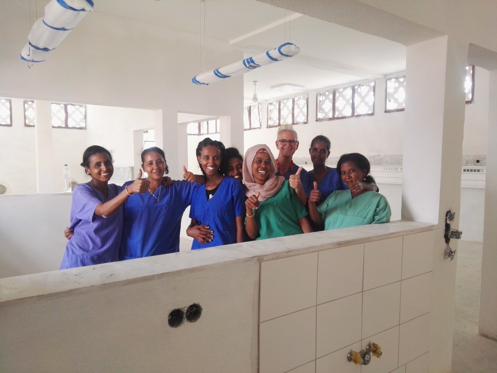 In Keren wurde nach den ersten Jahren klar, dass wir mit den Räumlichkeiten nicht klarkommen.Es baute sich im Laufe der Jahre ein Stamm von Schwestern auf, die zum Teil auch eine 2 jährige Ausbildung absolviert hatten. Wir motivierten die Jungen Schwestern und Ärzte, schulten sie und bildeten sie weiter. Immer mehr Frauen kamen in die Klinik um ihre Kinder sicher zu entbinden, es sprach sich herum, dass sie dort Hilfe bekamen. So wurde mit der Gesundheitsministerin in Eritrea , Archemed und einem deutschen Architekten die Idee für eine Mutter und Kindklinik (Perinatalzentrum) in die Tat umgesetzt. Unser Team wurde in die Planungen mit einbezogen und so entstand in den letzten 5 Jahren ein beachtlicher Bau auf dem Klinikgelände. Dort befindet sich nun ein großer Kaiserschnitt OP Tür an Tür mit unserer Intensivstation für ca 30 Früh und Neugeborene. Ebenso ist die geburtshilfliche Abteilung mit Keißsaal und Untersuchungsräumen ausgestattet um sichere Geburten zu gewährleisten. Im hinteren Bereich der neuen Klinik befinden sich die Mütter und Patientenzimmer, ebenso Duschen und Toiletten, was die meisten nichtmal zu Hause haben von den Einheimischen. Das Gebäude hat eine eigene Wasser,Strom und Sauerstoffversorgung.