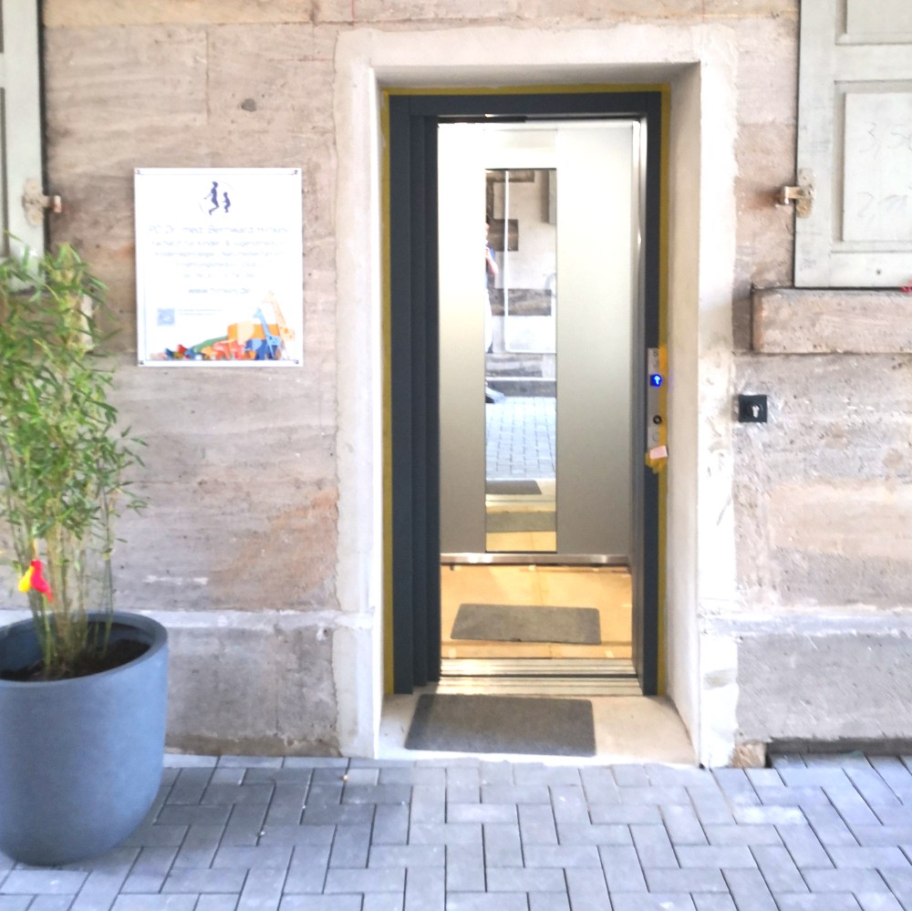 Ob mit dem Rollstuhl oder schwer beladen mit Kindersitz & Co – Sie gelangen bequem per Aufzug direkt an unsere Anmeldung im ersten Stock des Gebäudes Marktplatz 1.